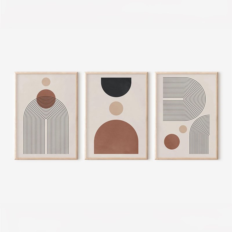 Δώστε έναν minimal και εκλεπτυσμένο χαρακτήρα στον τοίχο σας με αυτό το τριπτυχικό σετ πινάκων Klentie. Οι αφηρημένες, γεωμετρικές συνθέσεις σε ζεστούς γήινους τόνους και οι καθαρές μαύρες γραμμές ακολουθούν την τελευταία τάση του Modern Boho design, προσδίδοντας αρμονία και ηρεμία στον χώρο.