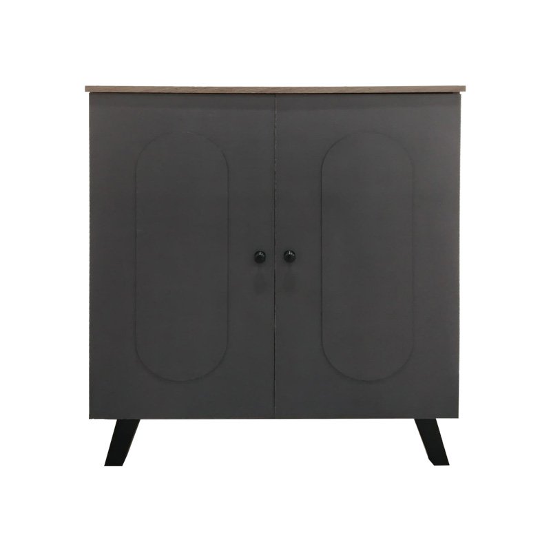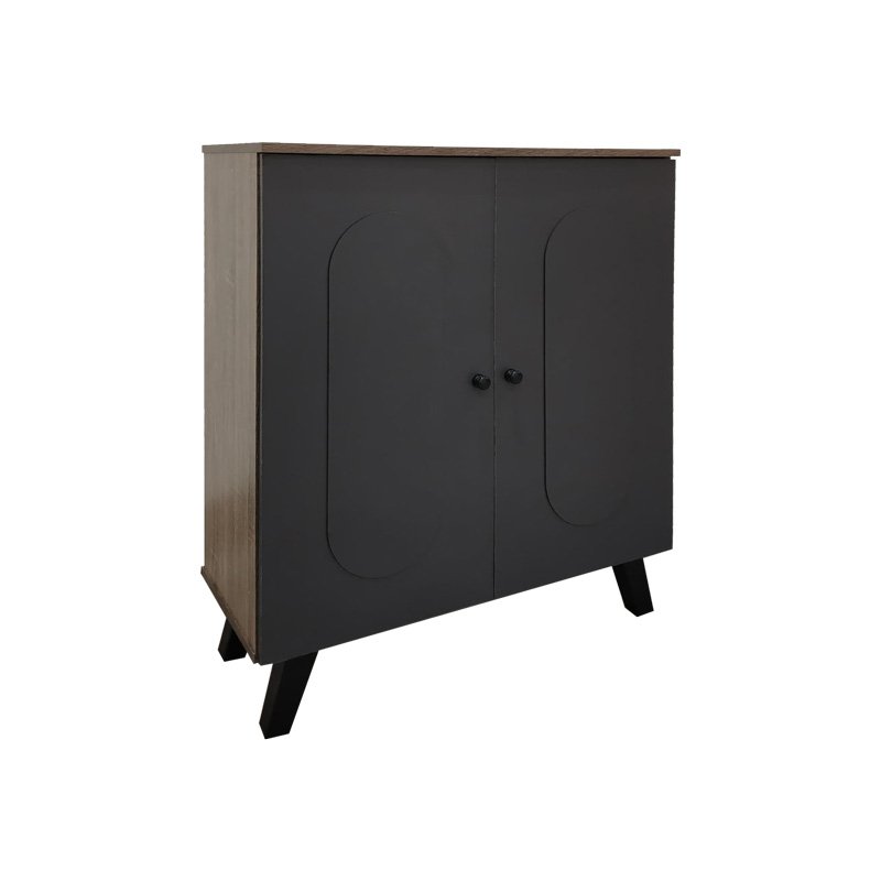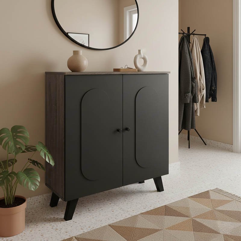 Η κομψή παπουτσοθήκη Cathi συνδυάζει μοντέρνο design με πρακτική λειτουργικότητα. Διαθέτει δύο πόρτες με χαρακτηριστικά οβάλ σχήματα και διακριτικά στρογγυλά χερούλια, προσδίδοντας μια παιχνιδιάρικη αλλά εκλεπτυσμένη αισθητική στον χώρο σας. Το εσωτερικό της προσφέρει αποθηκευτικό χώρο για την τακτοποίηση των υποδημάτων σας. Η χρωματική αντίθεση δημιουργεί ένα ευχάριστο οπτικό ενδιαφέρον. Στηρίζεται σε τέσσερα πόδια σε μαύρο χρώμα που ενισχύουν το μοντέρνο στυλ και προσφέρουν σταθερότητα.