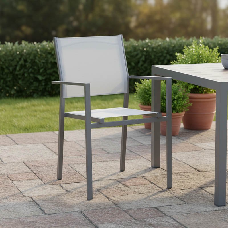 • Textilene: Το textilene είναι ένα εξαιρετικά ανθεκτικό υλικό που χρησιμοποιείται ευρέως σε επίπλωση εξωτερικών χώρων και εξαρτήματα. Αποτελείται από πολυεστερικές ινώδεις που επικαλύπτονται με PVC (πολυβινυλοχλωρίδιο), δημιουργώντας ένα υλικό που συνδυάζει ανθεκτικότητα, αντοχή στις καιρικές συνθήκες και εύκαμπτη υφή. Το υλικό αυτό επιτρέπει τη διέλευση του αέρα, βοηθώντας στη διατήρηση μιας δροσερής αίσθησης κατά τη χρήση.