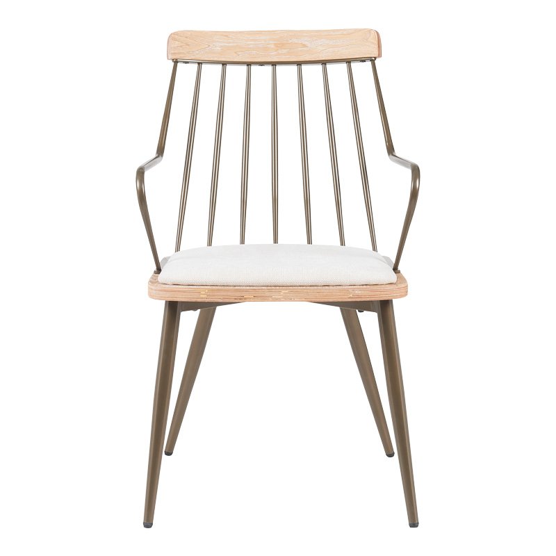 Η πολυθρόνας τραπεζαρίας Posse διακρίνεται για τον εκλεπτυσμένο βιομηχανικό της σχεδιασμό. Διαθέτει ένα άνετο, λεπτό μαξιλάρι καθίσματος , το οποίο πλαισιώνεται από έναν κομψό μεταλλικό σκελετό. Η πλάτη αποτελείται από κάθετες μεταλλικές ράβδους που καταλήγουν σε μια οριζόντια, ξύλινη λεπτομέρεια, προσδίδοντας μια διακριτική αντίθεση. Τα λεπτά, κωνικά μεταλλικά πόδια ενισχύουν την αίσθηση ελαφρότητας και σταθερότητας. Οι καμπύλες μεταλλικές χειρολαβές προσφέρουν επιπλέον άνεση και στυλ.