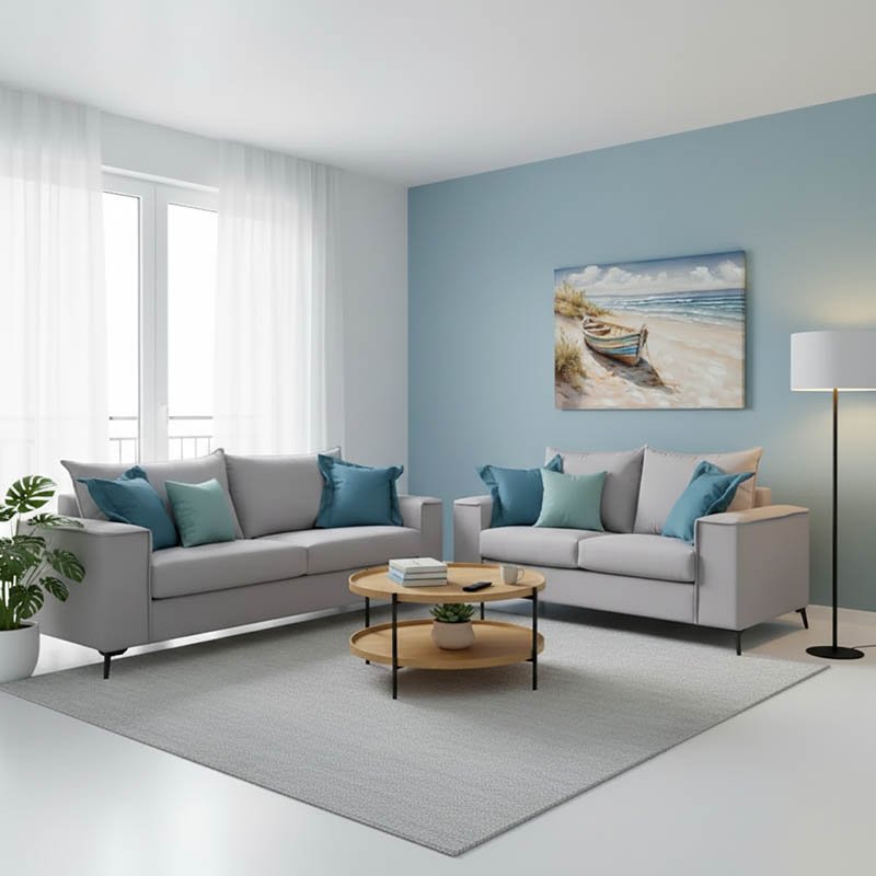 Σετ σαλονιού 2τεμ Verona pakoworld ανοιχτό γκρι ύφασμα με μαξιλάρια σε μπλε απόχρωση