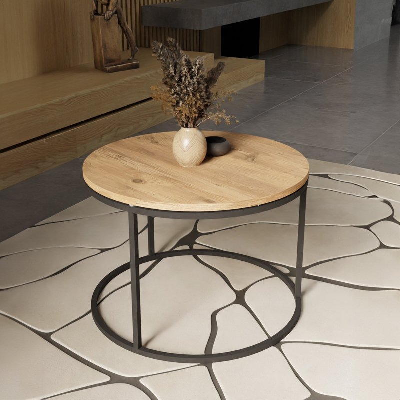 Τραπέζι σαλονιού Drion pakoworld oak μελαμίνης-μαύρο μέταλλο Φ60×40εκ