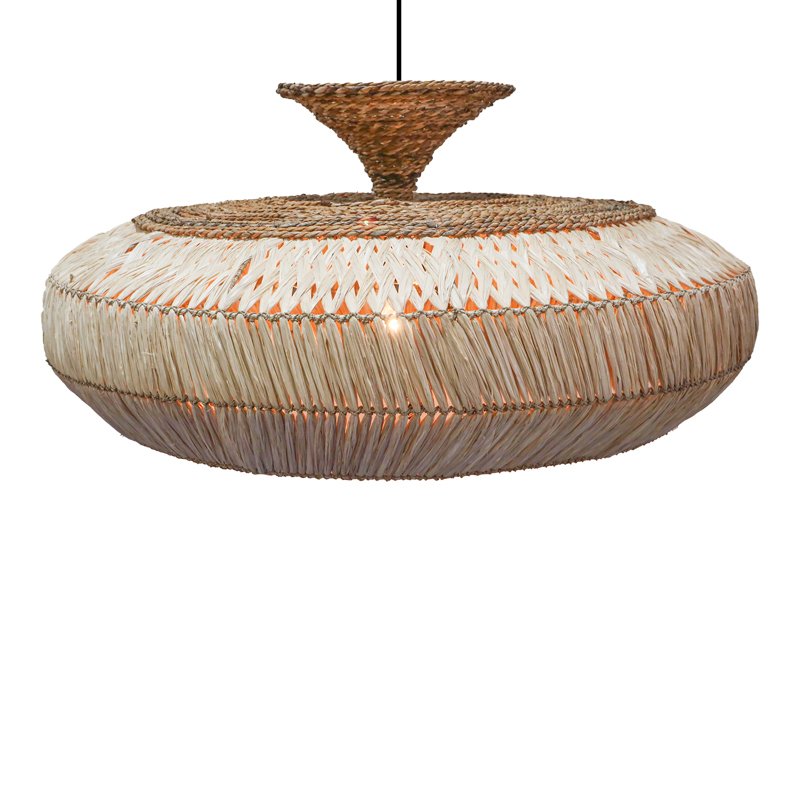 • Sisal: Το sisal, που προέρχεται από τα φύλλα του φυτού Agave sisalanaκαι αποτελεί μια φυσική ίνα που βρίσκει εφαρμογή σε διάφορες κατασκευές, συμπεριλαμβανομένων και των φωτιστικών. Φημίζεται για την ανθεκτικότητα και την αντοχή του στη φθορά, καθιστώντας το ιδανικό για μακροχρόνια χρήση. Χάρη στην ιδιότητά του να διαχέει το φως, δημιουργεί μια απαλή λάμψη.